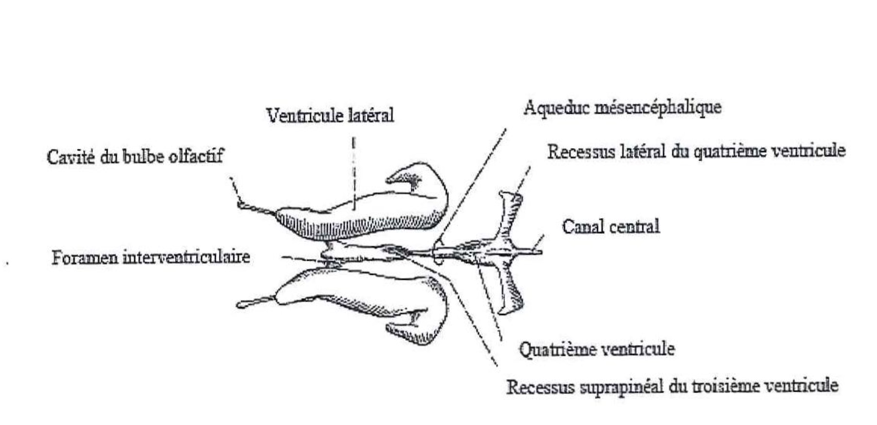 L’hydrocéphalie se définit comme une dilatation du système ventriculaire cérébral, consécutive à une augmentation du volume du liquide céphalo-rachidien. Le LCR est produit par les ventricules latéraux et la tela choroïda des troisième et quatrième ventricules (60 à 75%) ; le reste provient du réseau capillaire pariétal. Il circule globalement depuis les ventricules latéraux vers le canal central de la moelle épinière (4). Son écoulement se fait via le troisième ventricule et l’aqueduc de Sylvius jusqu’au quatrième ventricule ; il rejoint ensuite l’espace sous-arachnoïdien, et baigne la moelle et l’encéphale. Il est partiellement résorbé au niveau des villosités arachnoïdiennes.