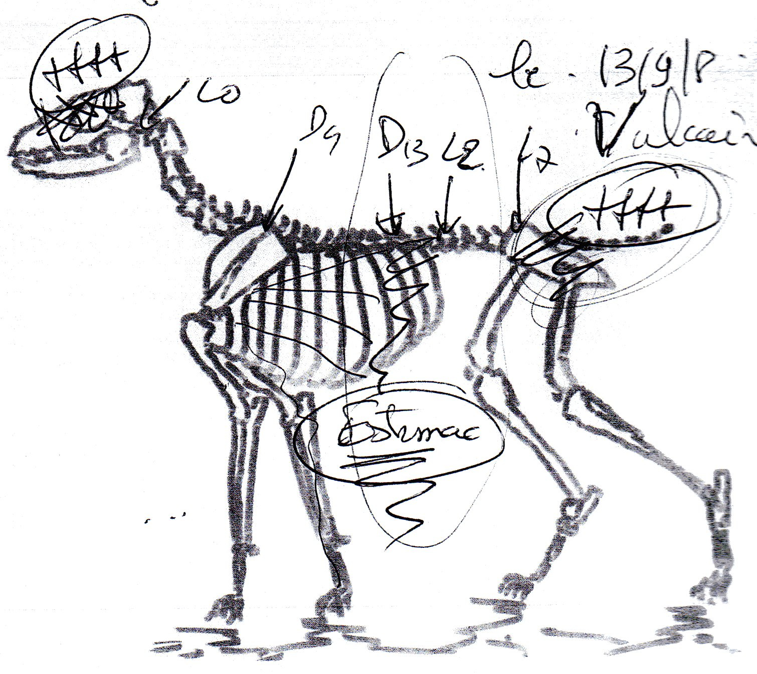 Vulcain ist eine 15 Monate alte Bordeauxdogge, die mit 8 Monaten wegen einer Osteochondritis am rechten Vorderlauf operiert wurde. Das recht starke Lahmen auf diesem Bein, und ausserdem auf dem linken Hinterlauf, hörte aber dadurch nicht auf. Sie läuft sehr steif (ihr Besitzer meint ״wie ein Roboter״). Im Vergleich zu ihren Artgenossen im gleichen Haus ist sie sehr unscheinbar, spielt nicht und schläft den ganzen Tag.