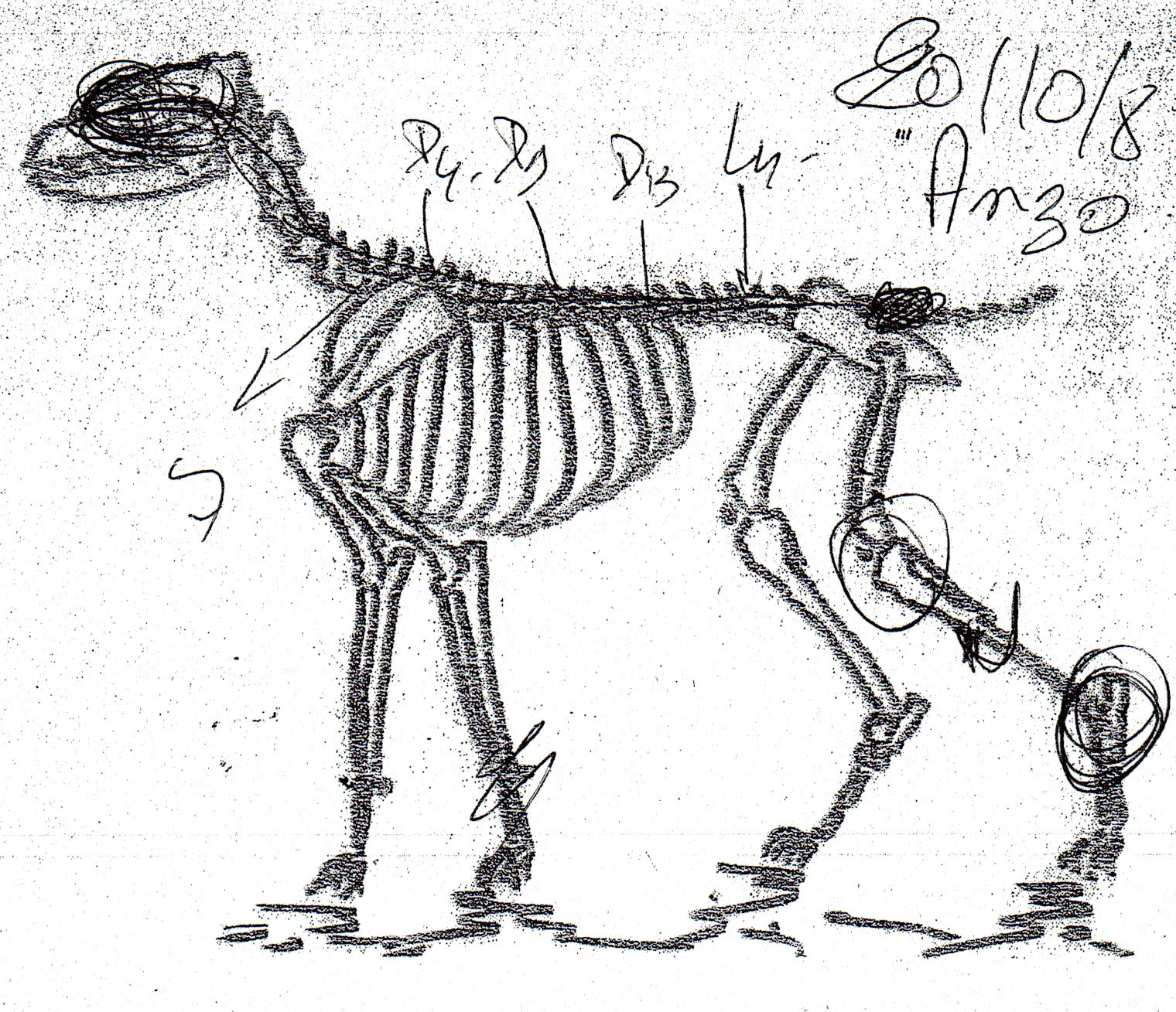 – Eine andere Gruppe befindet sich auf der Rückenmarksachse (Schädel bis Schwanzwirbel) und zeugt von erhöhtem Zug am Rückenmark (Kraft der medullären Traktion = KMT). In diesem Zusammenhang sei an die Komplikation der Operation vor drei Jahren (Kupieren der Rute) erinnert, die zum hoch aufragenden Schwanz führte.
