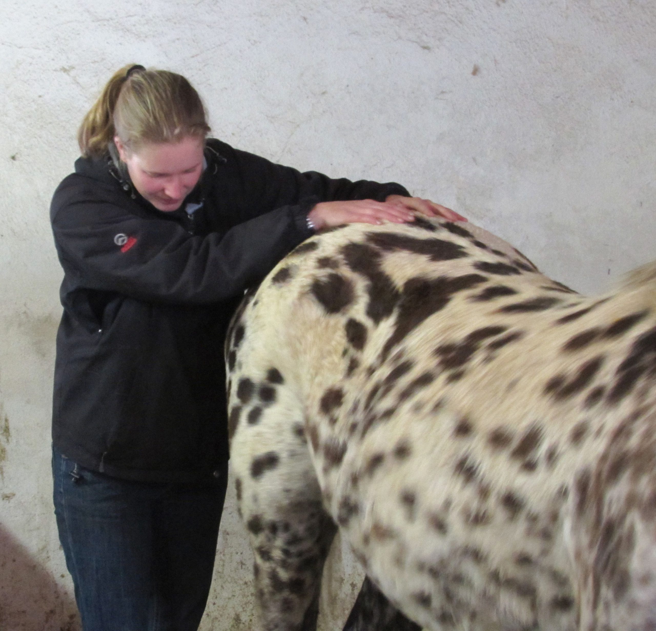 Malibu, 14 ans, n’est pas montée et fait des poulains une année sur 2 environ et n’a jamais eu de soucis de ce côté là auparavant. Après avoir fait le tour, je ne trouve aucune douleur ni tension dorsale, mais une très légère dysfonction au niveau du sacrum et surtout le point ovaire droit très sensible. Après libération du sacrum je travaille essentiellement sur le point ovaire. Celui décrit par Dominique Giniaux dans son livre « Soulagez votre cheval aux doigts… et à l’œil !». Point qui se situe en arrière de la dernière côte dans un creux avant que K18 ne rejoigne K17. J’aurais un SMS 2-3 jours plus tard de la propriétaire ravie qui m’informe que l’étalon peut dormir tranquille maintenant que Malibu a bien voulue de lui, et qu’elle n’a pas bougé une oreille lors de la saillie… Je ne savais pas si en travaillant une seule fois sur le point cela suffirait et bien apparemment si ! J’avais déjà eu des résultats franchement concluants avec ce point sur ma jument il y a quelques années pour un autre type de problème. Elle a toujours été «pisseuse», pénible +++ lors des chaleurs. Depuis que j’ai découvert le point de Giniaux, je l’ai massé tous les 3 premiers jours des chaleurs pendant plusieurs mois et l’année d’après tout s’est stabilisé, elle a complètement changé alors que ça faisait des années qu’elle était comme ça et je n’ai plus jamais eu a y retoucher ! L’effet a été bien durable. Comme quoi ce point est vraiment magique !