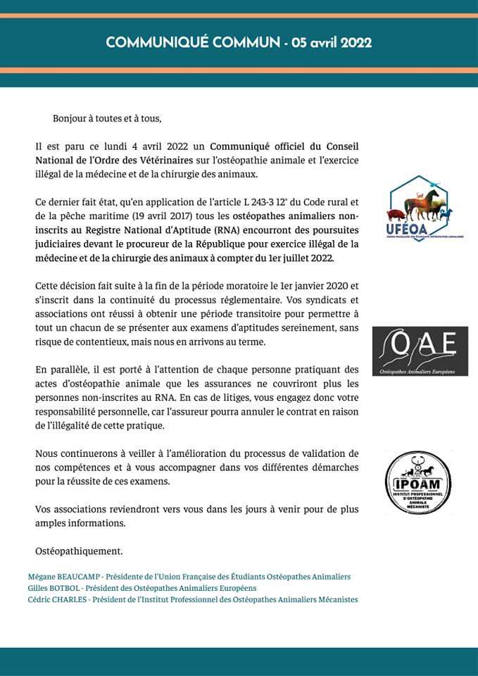Considérant que la publication des textes réglementaires, pris en application de l’article L 243-3 12° du Code rural et de la pêche maritime, le 19 avril 2017, a permis aux personnes concernées de se mettre en conformité avec la loi en leur laissant le temps nécessaire, le Conseil national de l’Ordre des vétérinaires, lors de la session de son conseil des 23 et 24 mars 2022, a pris la décision d’engager, à partir du 1er juillet 2022, toute procédure contentieuse qu’il jugera utile à l’égard des personnes réalisant des actes d’ostéopathie animale en situation d’exercice illégal de la médecine et de la chirurgie des animaux devant les procureurs de la République.
